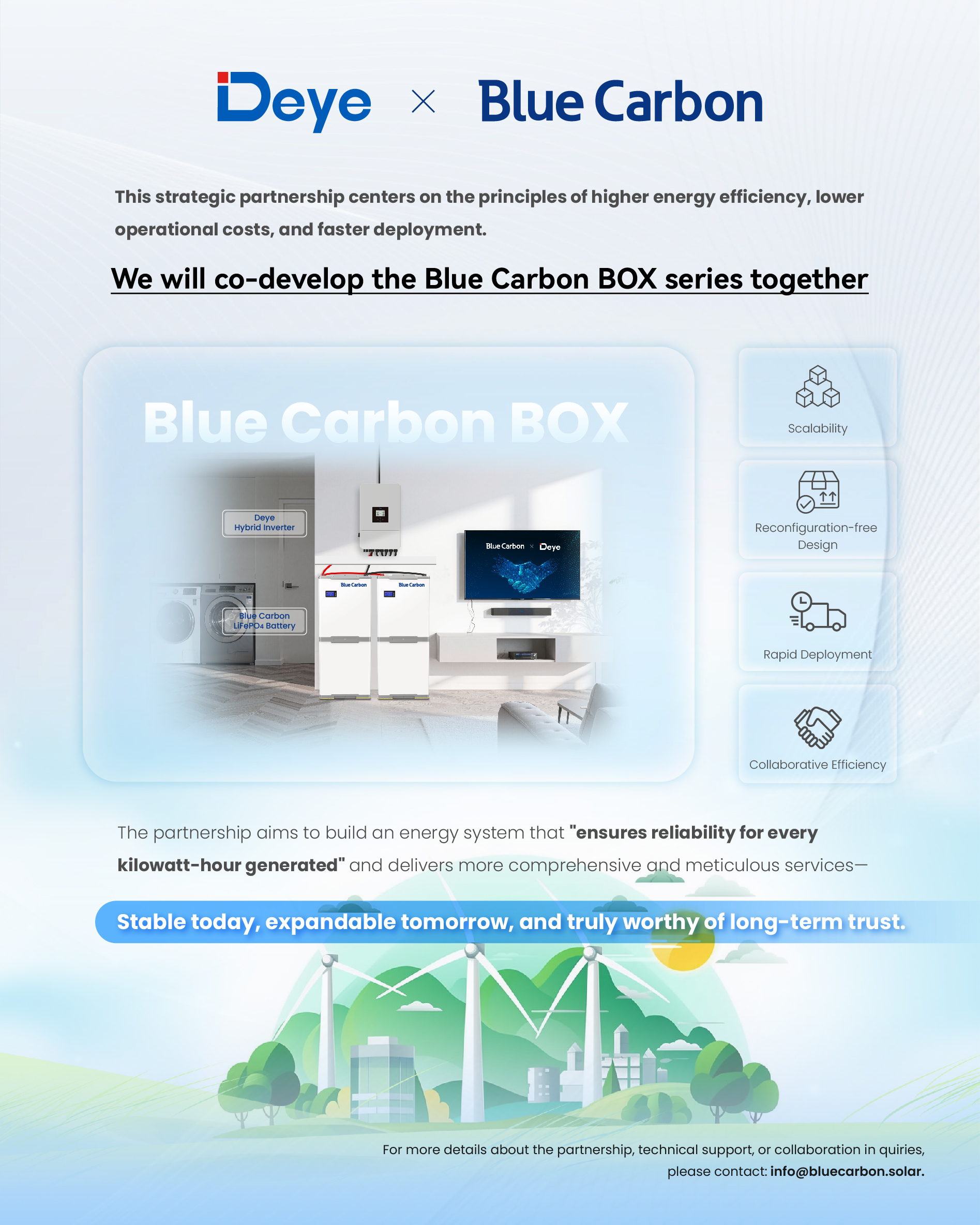 Die Zusammenarbeit konzentriert sich auf die gemeinsame Entwicklung der Blue Carbon Box-Serie, eines Energiesystems der nächsten Generation, das die fortschrittlichen Hybridwechselrichter von Deye und die Hochleistungs-Lebensdauer von Blue Carbon kombiniert. Mit Funktionen wie flexibler Skalierbarkeit, rekonfigurationsfreiem Design und schneller Einstellung wird die Blue Carbon-Box-Serie entwickelt, um „Zuverlässigkeit für jede erzeugte Kilowattstunde zu gewährleisten“, wodurch eine verbesserte Energieeffizienz, reduzierte Betriebskosten und schnellere Einsatzzeitpläne bereitgestellt werden.